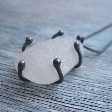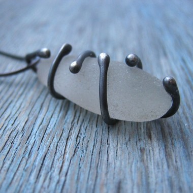Each piece of sea glass I find is unique – tumbled and smoothed by the ocean not one piece of glass is ever the same as another. An armature of silver wire is custom made to fit each piece of glass and 6 prongs are wrapped around the sea glass to hold it firmly in place. These particular pendants are wrapped in oxidised silver and hung from a 50cm oxidised snake chain.