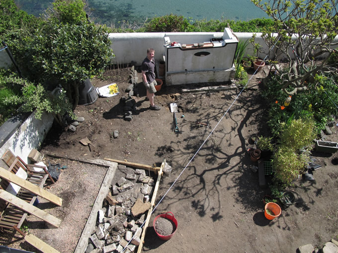 This is a shot of the garden from above showing where we’re putting the foundation for the greenhouse. We discovered the foundations that must have been used for a greenhouse years ago and we’re extending this. It was full of really good soil, so we dug this out and that is now a mountain the dog loves to climb on the other side of the garden. We then dug up all the gravel that the previous owner has covered the garden up with (hence the expanse of bare soil) and poured this into the hole we’d created – we also gave tons away on Freecycle as there was so much of it.