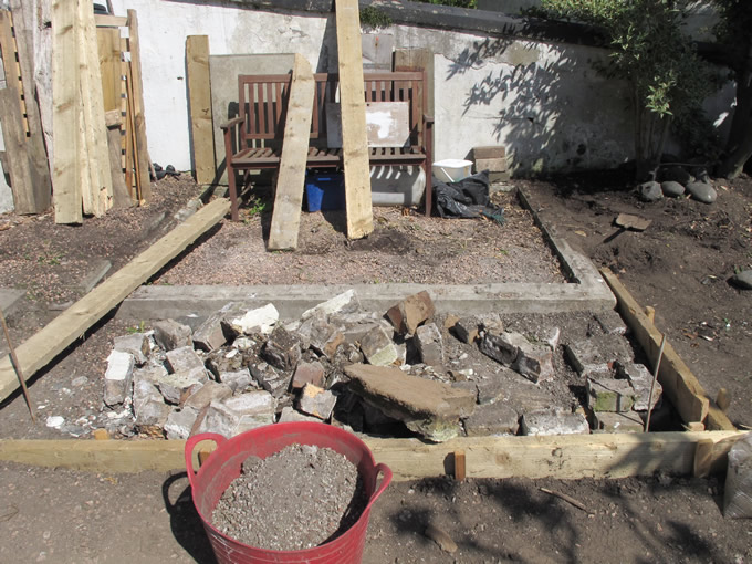 As we’d decided to extend the foundation area for the greenhouse, so that we could have pots and a bench around the side of it, we needed additional rubble and it was a joy to dump all the decorative chips in there.