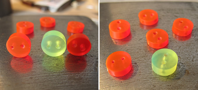 Luckily it was Friday and so I packed everything up and headed to college to see if my tutor could come up with a solution. Thankfully Andrew has an answer for any question and anything is possible in his workshop, so he dug out a little drill that works at really slow speeds and this did the trick. It took a while but I managed to drill through all my buttons with only a few melting incidents. Yay!