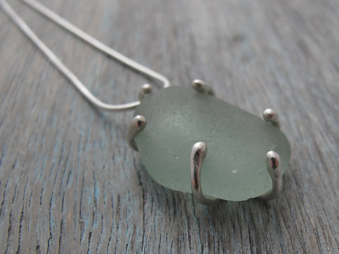 That is beautiful in it’s simplicity. I even like the graphic contrast of the bright metal against the soft matte glass on the back, and would wear it either way myself. I love sea glass. Good job.