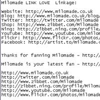 I just thought of something else I should share that will save you a lot of time and bother. If you’re going to get into the Link Love thing and start spreading some love about on Facebook, then I advise you to set up a text file on your computer that has all the info in it. This way you can simply copy and past the links from the text file into the Link Love discussions quickly and easily without having to type it all out every time. I have a block of text that is the info I use for Link Love. I also have a sentence and link that says that I’m your latest fan, that I use to post on people’s walls, so that even though I’m posting as Evie Milo, they get a link to my Milomade page. I’ve also got a sentence that says ‘Thanks for fanning Milomade’. It does make life a lot easier!