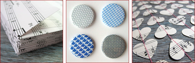 On the stationery front there is a selection of music and snoopy envelopes (£2.95) as well as some packs of gift tags (£2.85) made from music and envelopes. If you want some hand crafted decorations then you’ll love the paper garlands (£11.50) I have created from music, maps, envelopes and beano magazines. If you like to accessories, then there is a box with 40 packs of badges (£2.85) for you to choose from, all made from sheet music, maps, envelopes and magazines.