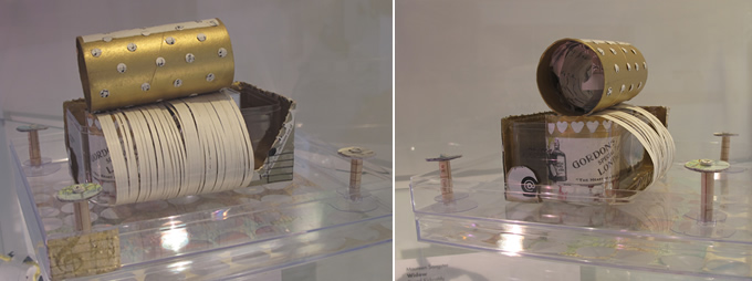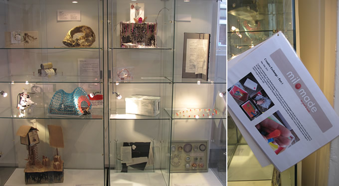 Next I  popped into the Town Hall to see the Scrap Exchange exhibition at long last. It looks great and each piece is displayed with a little note of what each artist received in their shoebox. Two glass cabinets displayed most of the work, but there were also some paintings and wall based work too.