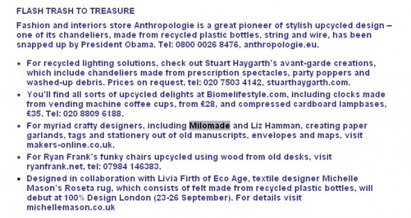 If you’re a reader of the Daily Mail then you’ll have been reading today’s You Magazine. Within it’s pages you’ll find an article all about Upcycling and Recycling featuring some rather crafty ladies – great article. What makes even greater is that Milomade is mentioned in the text right at the bottom – hurrah!